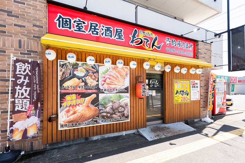わてん 賀来店は、大分市賀来南1丁目にある居酒屋。カウンタ―以外は全席個室で、ゆったりお食事・飲み会を楽しむことができます。料理は、炭火で香ばしく焼き上げた焼き鶏をメインに多彩なメニューをラインナップ!曜日限定の割引サービスもあり、お得に・美味しく・ゆったり過ごせる居酒屋です!ぜひお気軽にご来店ください。